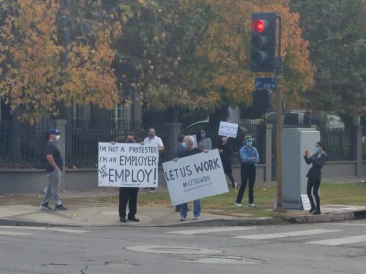 Group of restaurant owners and workers protesting against outdoor dining ban outside of Los Angeles Mayor's mansion (Shant Mirzaians/The Wash)